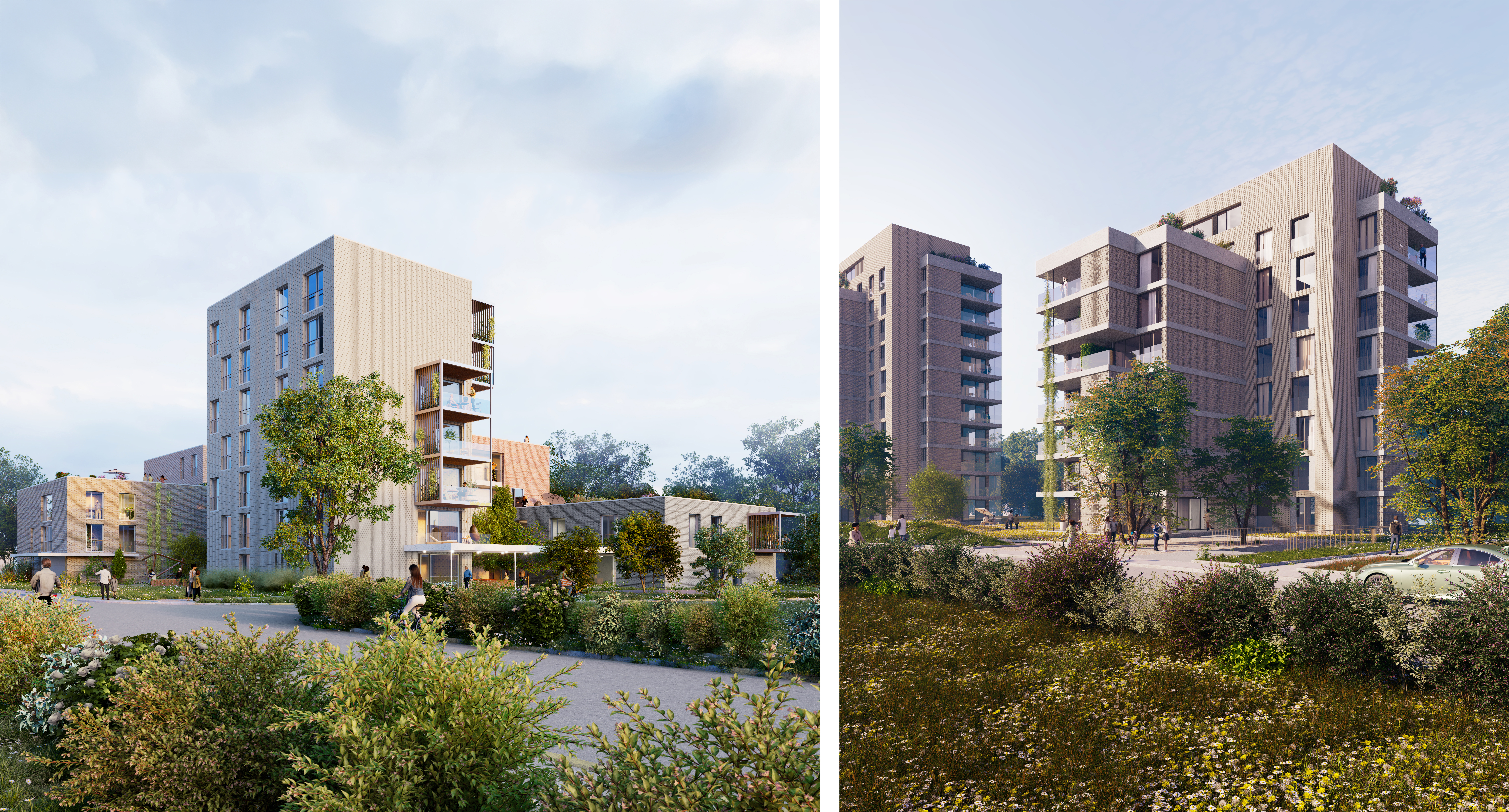 Die Gebäude sind kompakt, haben eine einfache geometrische Form und eine schlanke Hülle: Sie sind sorgfältig als visuelle Einheiten konzipiert. Auch die Fensterformate sind begrenzt, um einen hohen Anteil identischer Elemente zu erhalten. Die Flachdächer, die größtenteils mit für die Region typischen Pflanzen begrünt sind, bieten viel Platz für Dachterrassen und die erforderlichen Photovoltaikanlagen.