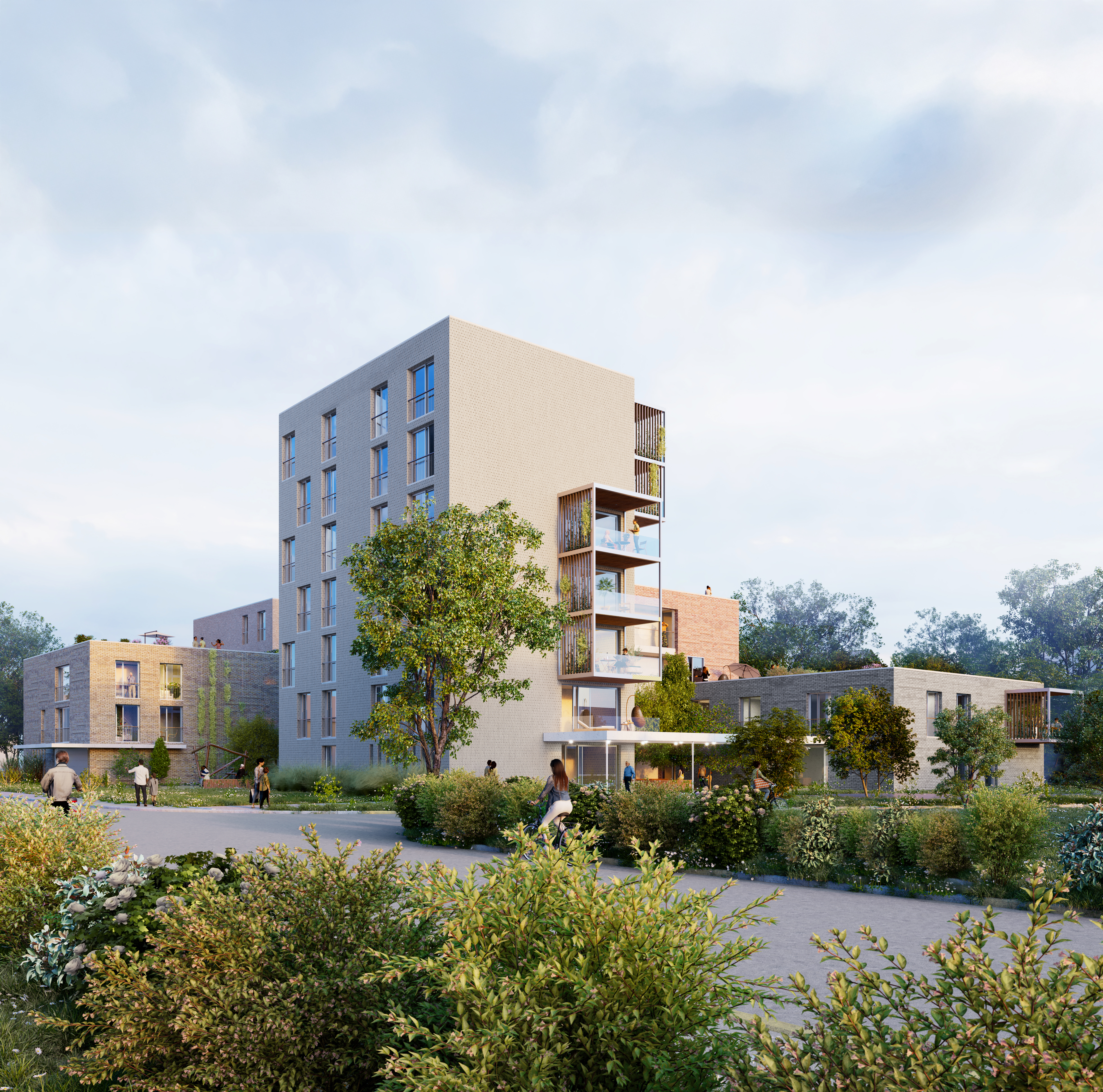 David s’inspire de la « tradition » du quartier supérieur et propose une construction massive réinterprétée avec un mur en briques ventilé. L’utilisation de la brique se distingue dans les cinq volumes par le type de maçonnage et l’orientation. Les nuances de couleurs et les types de mélange de la brique en maçonnerie, finement coordonnés, donnent à chaque volume une expression unique au sein de l’ensemble et donnent l’impression d’un quartier qui a grandi. Les balcons en saillie et regroupés sont conçus dans une structure en acier raffinée avec des filtres en bois.