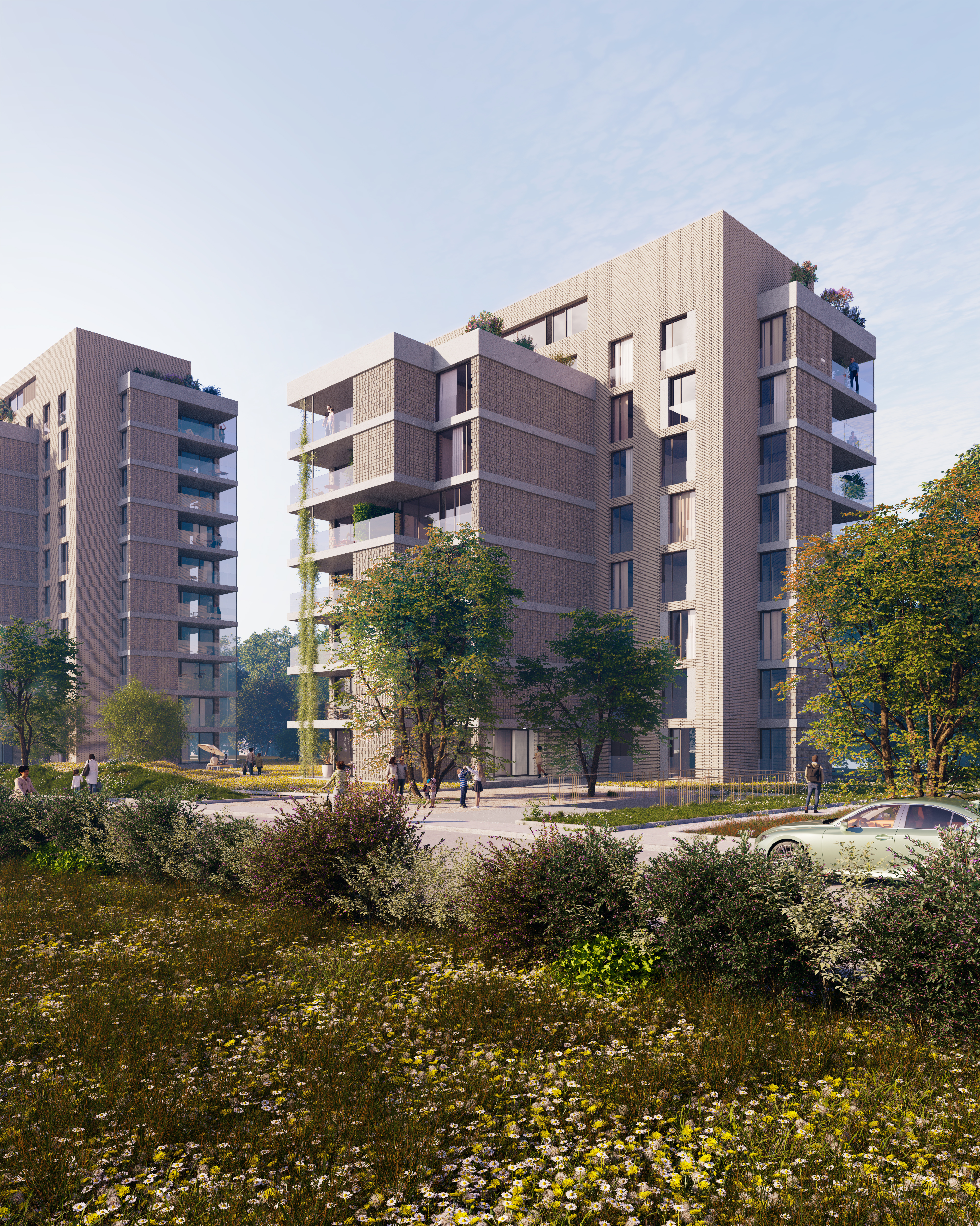 Chez goliath, les façades sud sont également utilisées pour les installations photovoltaïques. Goliath s’inscrit également dans la « tradition » de la construction en tuiles ou en briques et offre une construction massive, réinterprétée avec un mur de tuiles aéré. Iici aussi, l’utilisation de la brique est au premier plan, grâce à différents types de maçonnerie et d’orientations, afin de souligner les volumes généraux. éa couleur est la même sur les deux tours afin de renforcer encore davantage ce duo. Des bandes de béton soulignent et mettent en valeur les différents volumes d’une tour. Pour les fenêtres à la française, balcons et balcons insonorisés, le verre est principalement utilisé pour les parapets et les éléments mobiles basculants afin de ne pas obstruer la vue impressionnante.